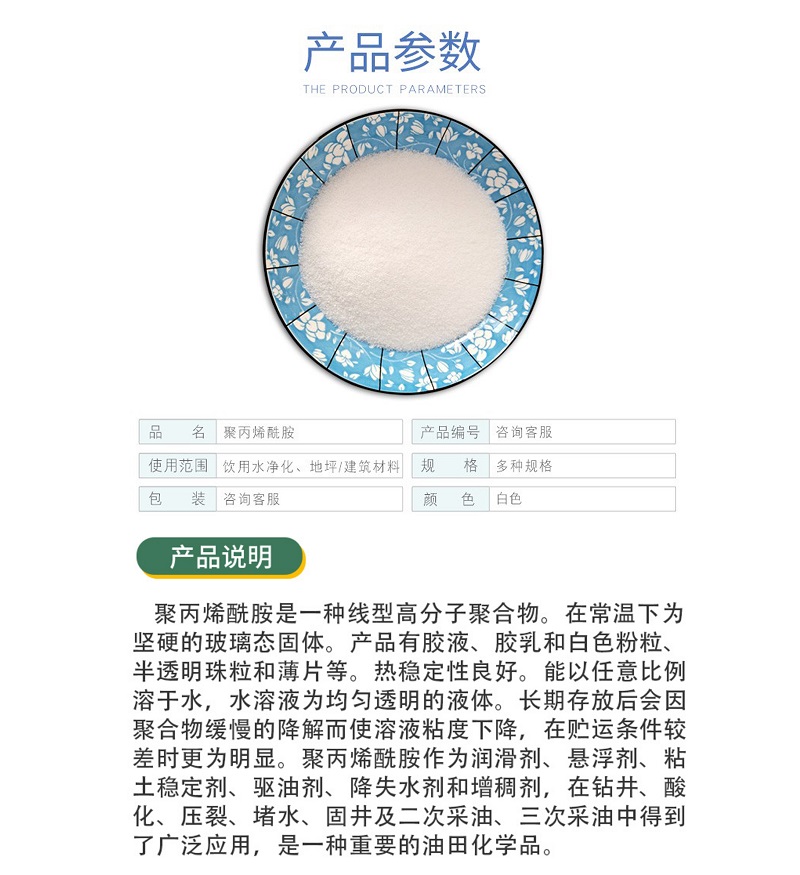 造紙助劑:在造紙工業(yè)中可用作紙張干強(qiáng)劑 助留劑 ,能極大的提高紙張質(zhì)量 節(jié)約成本,提高造紙廠的生產(chǎn)能力。可以直接與無(wú)機(jī)鹽離子,纖維以及其它有機(jī)高分子發(fā)生靜電橋梁作用以達(dá)到增強(qiáng)紙張的物理強(qiáng)度,減少纖維或填料的流失。加快濾水 起到了增強(qiáng) 助留 助濾的作用,同時(shí)在脫模過(guò)程中起到了明顯的絮凝效果。